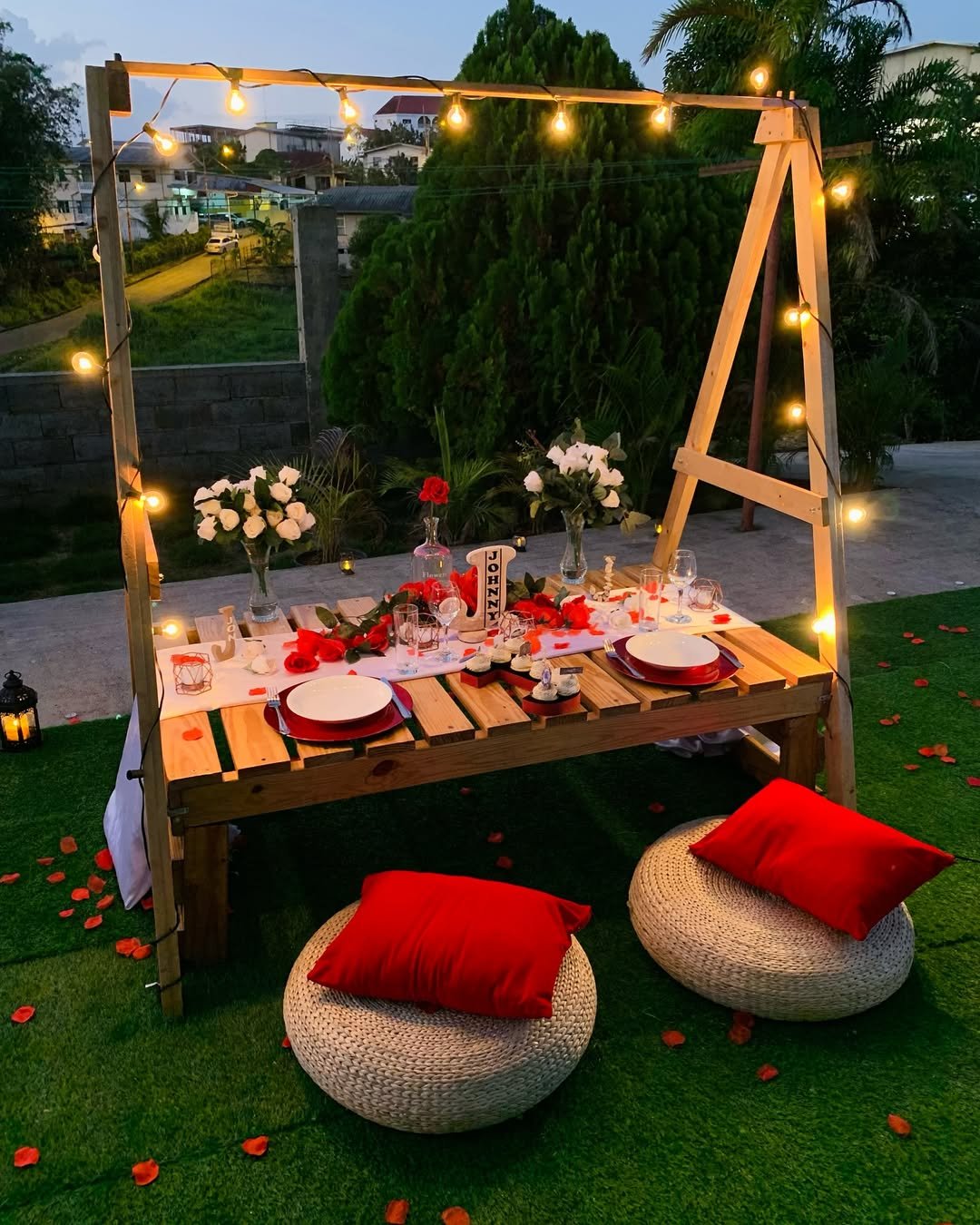Is it even a picnic if it’s not under twinkling lights? @memorymakers.tt nailed the dreamy dinner vibe with this low-table outdoor setup. Complete with bold red accents, soft pouf seating, and rose petals scattered like confetti.