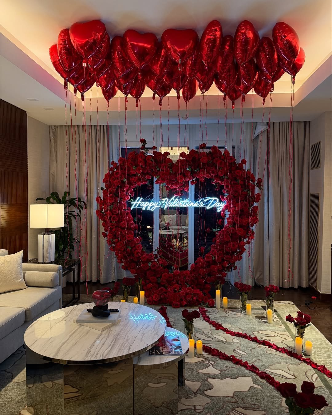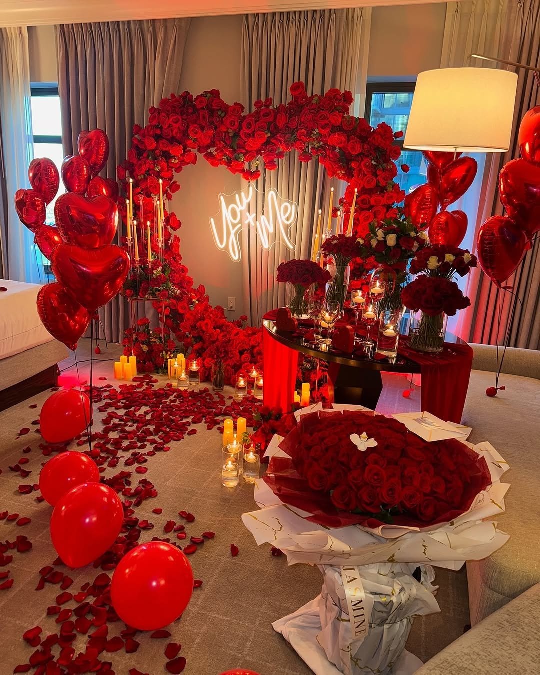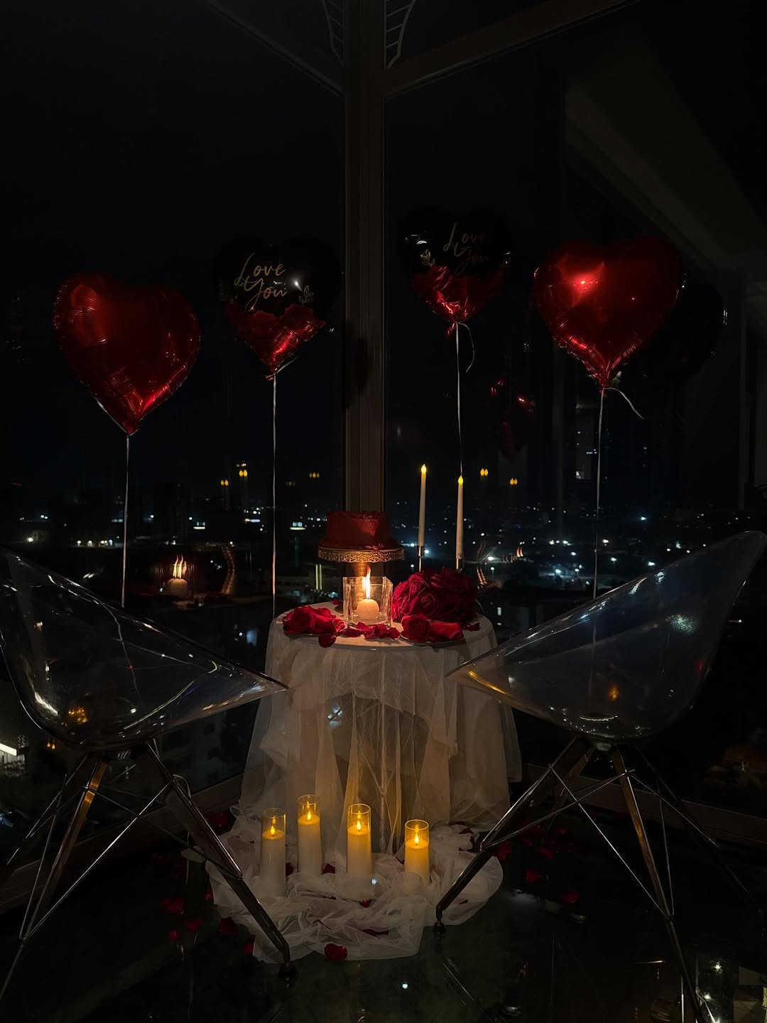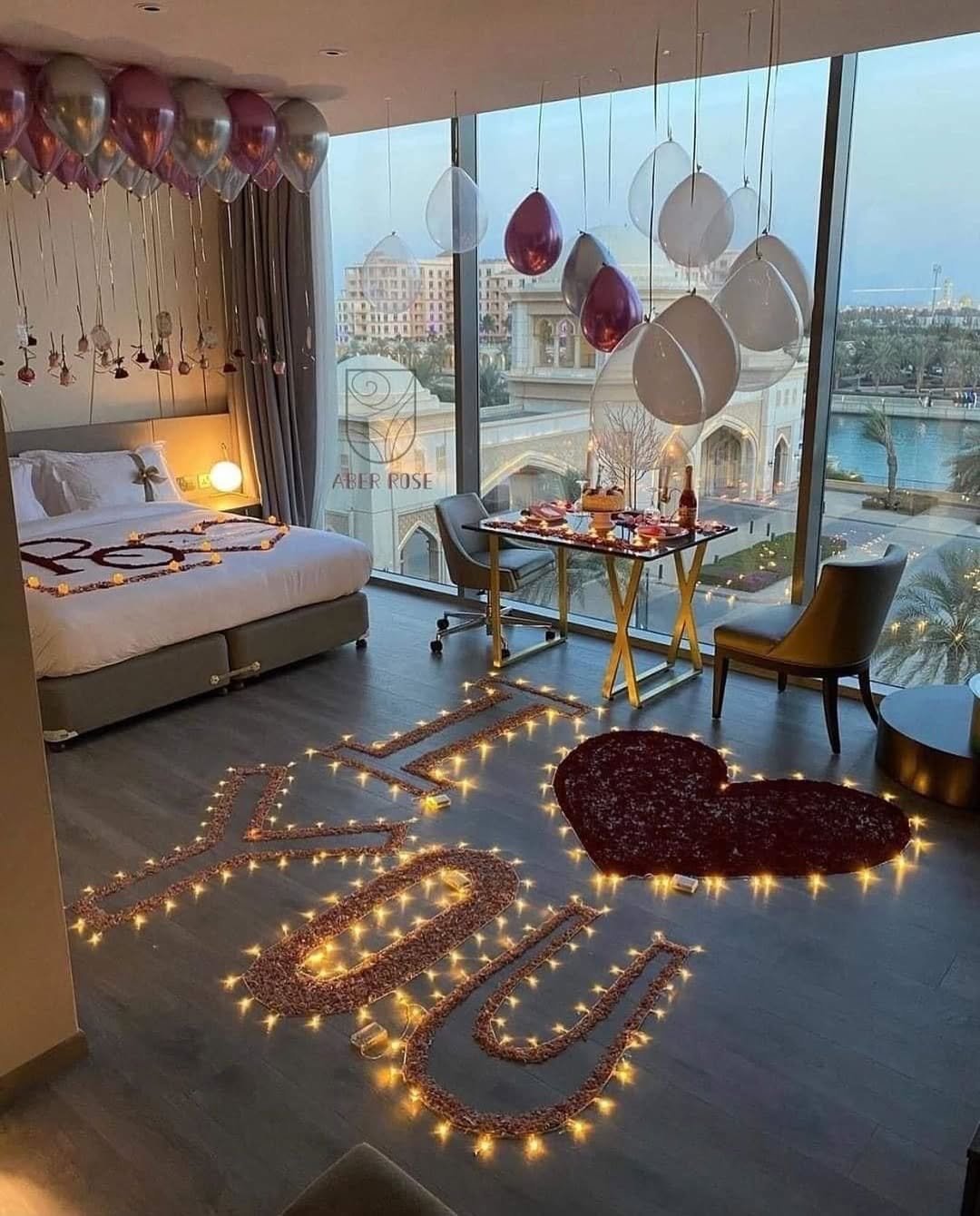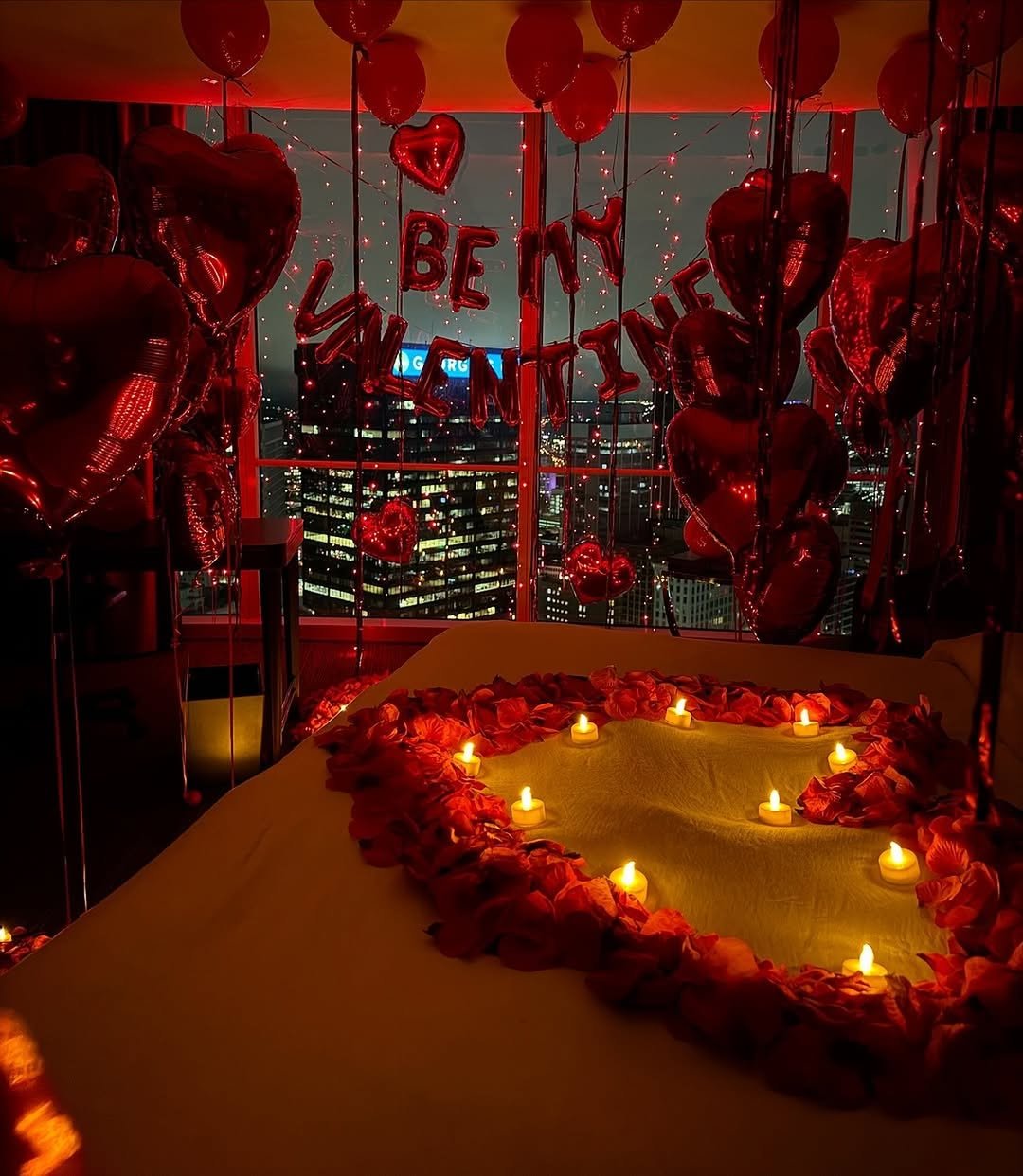 When you want to celebrate love without leaving your hotel suite, this is how you do it. “I ❤️ YOU” spelled out in lights on the floor, heart-shaped balloons drifting across the ceiling, and a table set for two overlooking the city skyline.