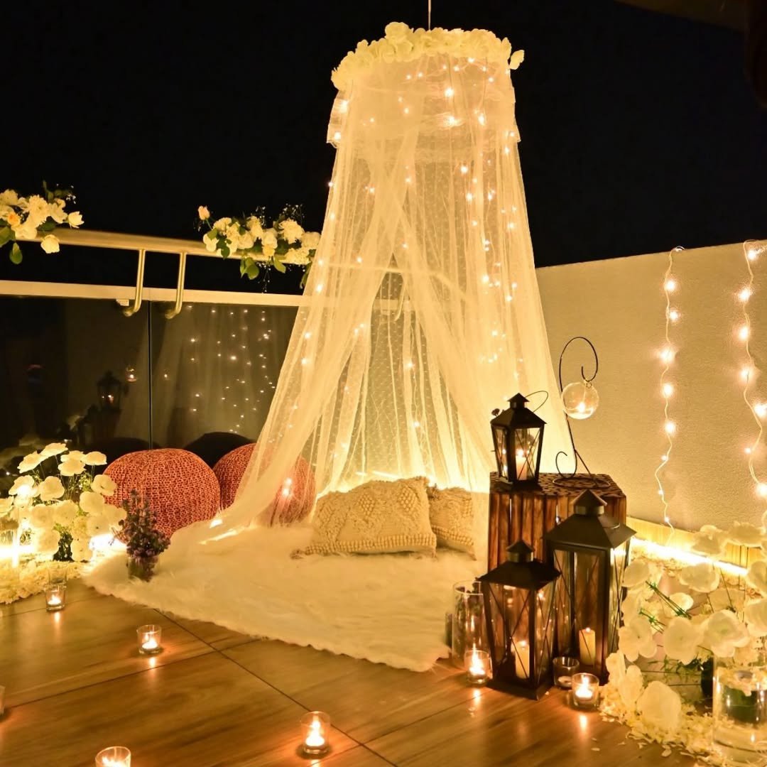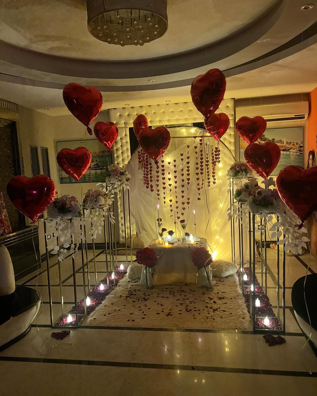 @surpriseplanner.in does not play when it comes to going big. This room explodes with roses, candles, and heart balloons like Cupid had a design degree. The giant heart backdrop with “You + Me” in glowing script? Chef’s kiss.