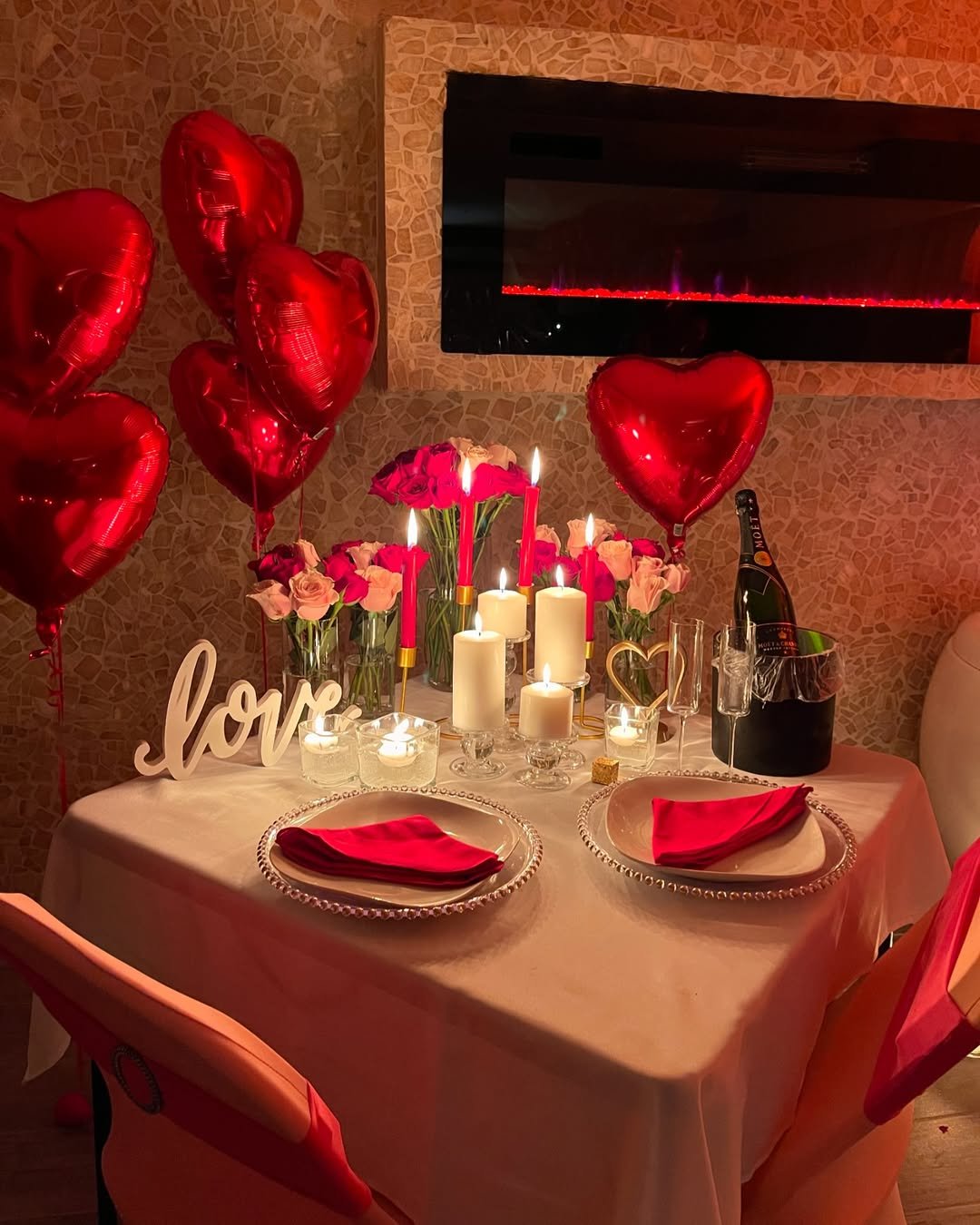 @livsluxurydecor knows how to do moody, romantic elegance. From the fireplace glow to the heart balloons floating like whispers of love, this candlelit table for two hits just the right balance of cozy and luxe.
