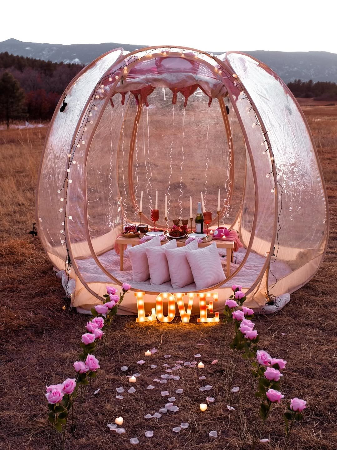 Imagine being whisked away into a transparent dome nestled in a golden meadow, surrounded by string lights and rose petals under a cotton candy sky. This setup feels like a fairytale proposal scene, complete with soft pillows, candelit dinners, and a glowing “LOVE” marquee that sets the tone from the very first step inside.