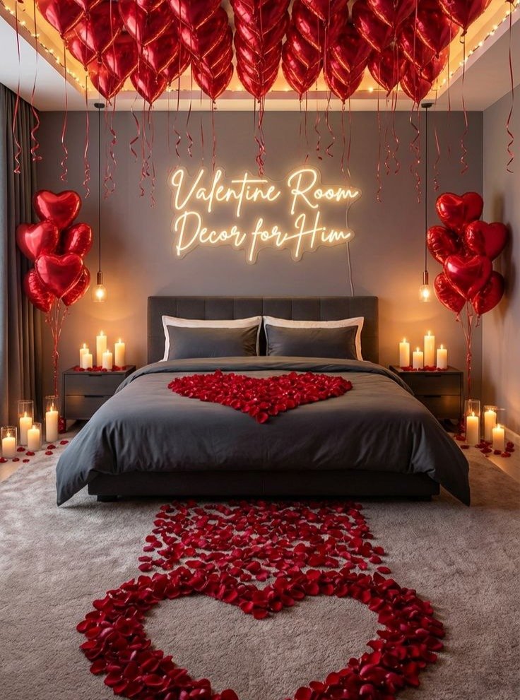 @riyadh_decor_events blends sleek, minimal design with all-out romance. The rose petal heart on the floor leads you to a plush bed framed by candles and crowned by heart-shaped balloons overhead. Oh, and that glowing “Valentine Room Decor for Him” sign? Iconic.