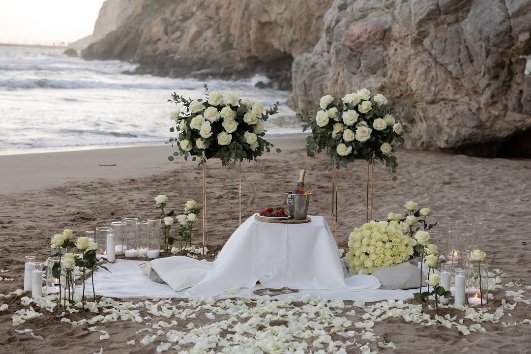 Sometimes simplicity is the most seductive. This beachside date is like a poem in neutral tones: ivory roses, soft candlelight, and the rhythmic hush of waves as your soundtrack. It’s minimal, but deeply romantic.