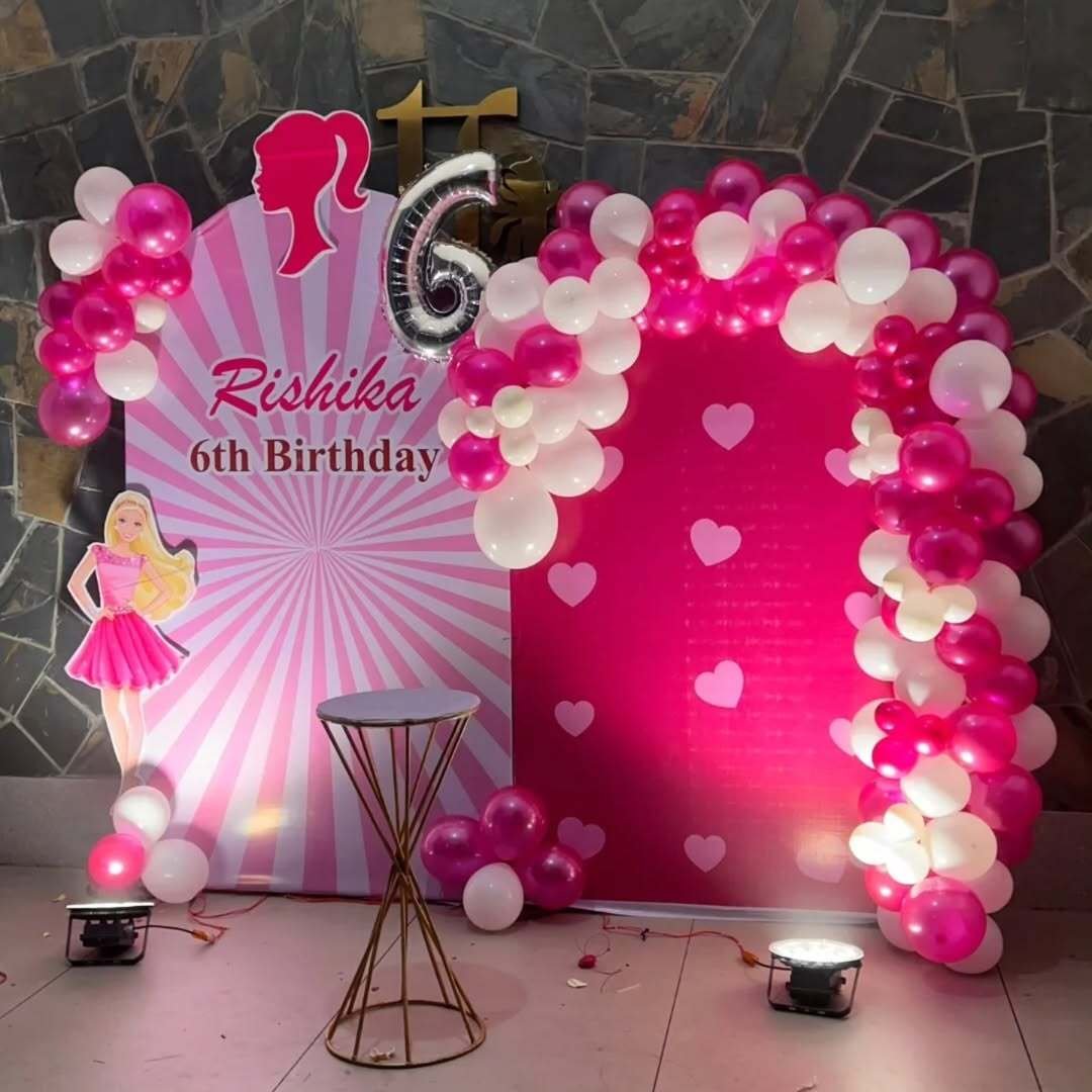 This Barbie setup feels slightly more glam and bold. Deep pinks, metallic rose gold balloons, and large character cutouts create a dramatic, photo-ready scene.