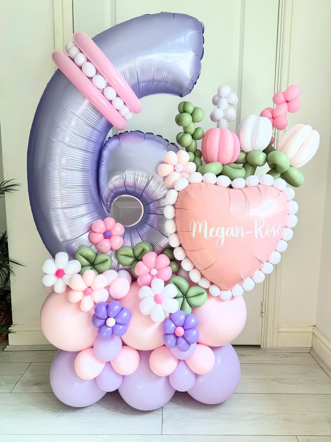 Here’s a theme that feels like a spring garden came indoors. The oversized lavender number 6, floral balloon clusters, and soft pink heart with custom lettering create a sweet, storybook mood.