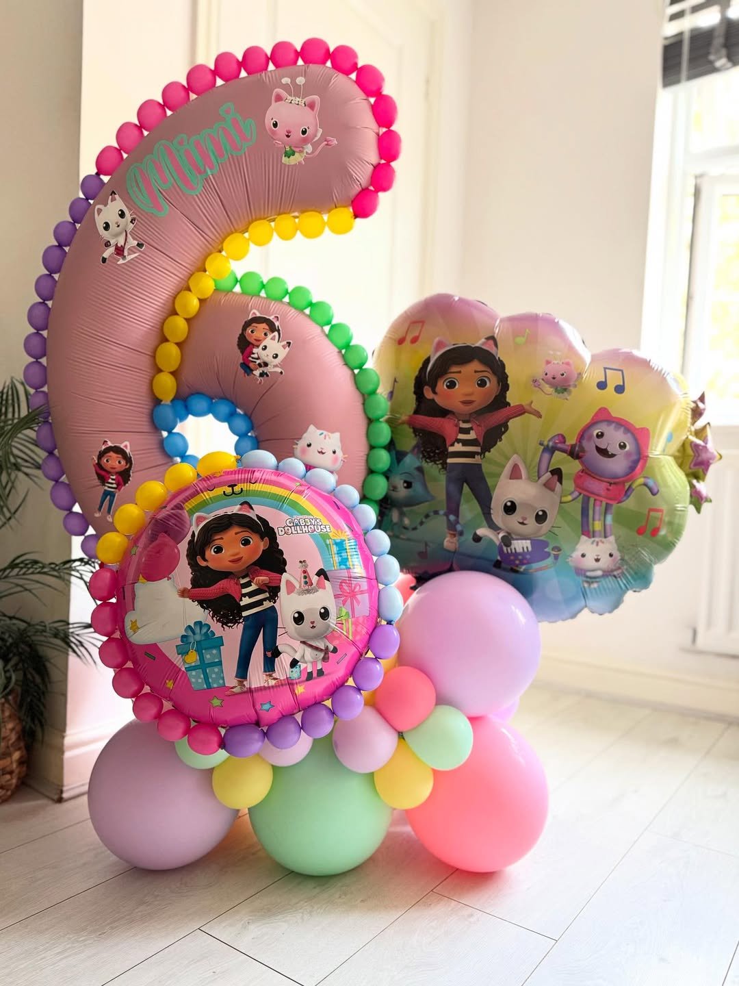 Ending on something sweet and compact, this Gabby’s Dollhouse balloon arrangement is perfect for smaller spaces or home celebrations. The large pastel number 6 paired with character balloons creates a joyful, colorful cluster.