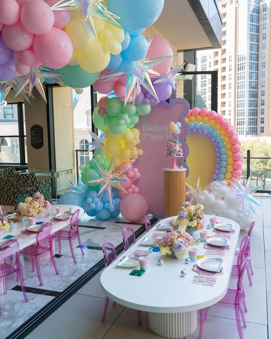 This setup feels like stepping inside a rainbow daydream. Iridescent starbursts float between pastel balloon clouds, and the rainbow arch wraps the whole scene in pure joy. The long white tables with pink acrylic chairs bring it back down to earth in the chicest way.