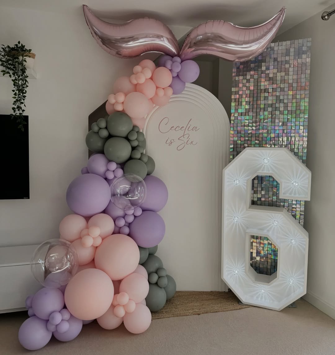 Mermaid dreams, but elevated. A layered white arch with a scale backdrop sets the stage, while pastel balloon clusters in lavender, pearl, and baby blue feel like sea foam drifting in. That oversized illuminated “6” is bold, yet it still feels cohesive.