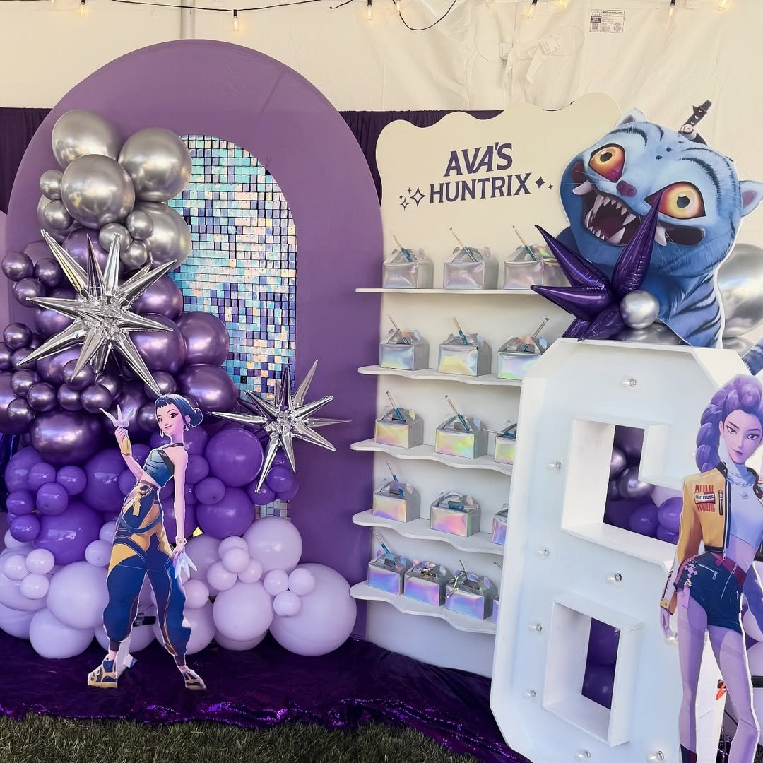 Moody purples and metallic silvers give this setup a cool, almost futuristic edge. The balloon arch layered with chrome starbursts feels bold and high impact, while the character cutouts and custom name sign keep it personal and fun.