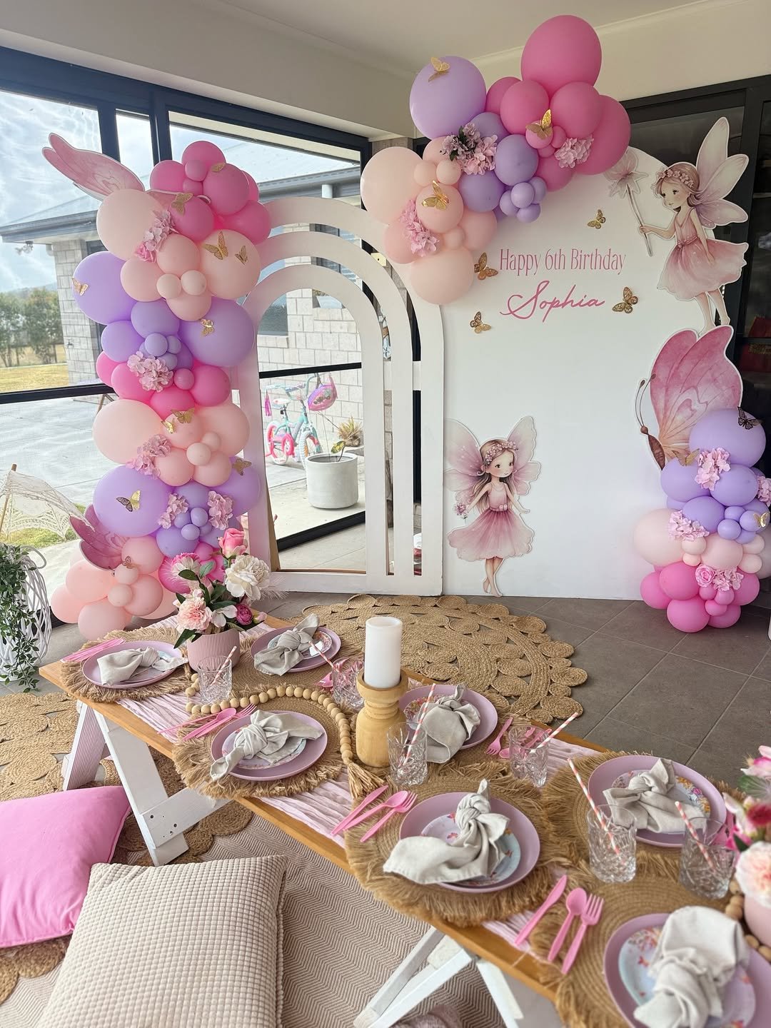 This one feels like stepping into a storybook. Fluttering butterflies, soft pink florals, and whimsical fairy illustrations create a scene that’s light, airy, and just a little enchanted. The layered arches add depth, making the whole backdrop feel thoughtfully designed rather than just decorated.