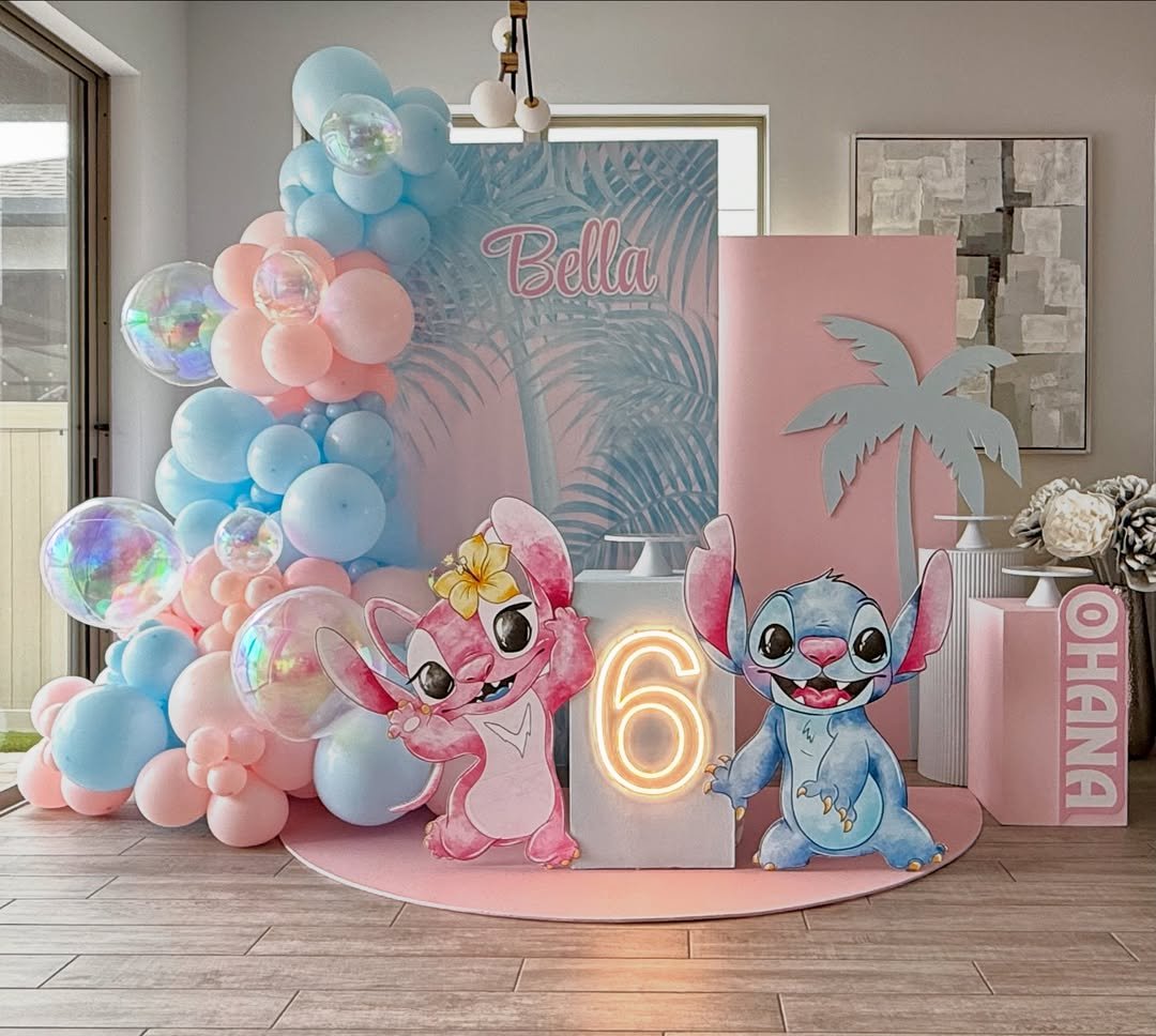 This one instantly transports you somewhere tropical. Blush and baby blue balloons frame the scene, iridescent bubbles catch the light, and Stitch and Angel bring that playful energy front and center. The glowing “6” adds just enough drama to anchor the sweetness.