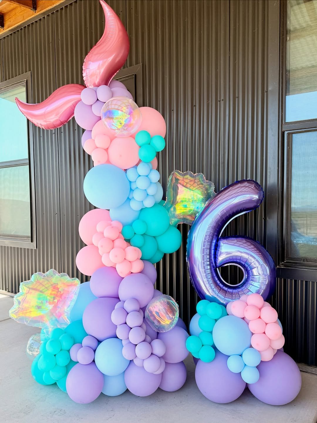 Cool aqua, lavender, and baby pink bubble together in this vertical mermaid-inspired display. The metallic number six shimmers in purple, catching the light against those holographic shell balloons.