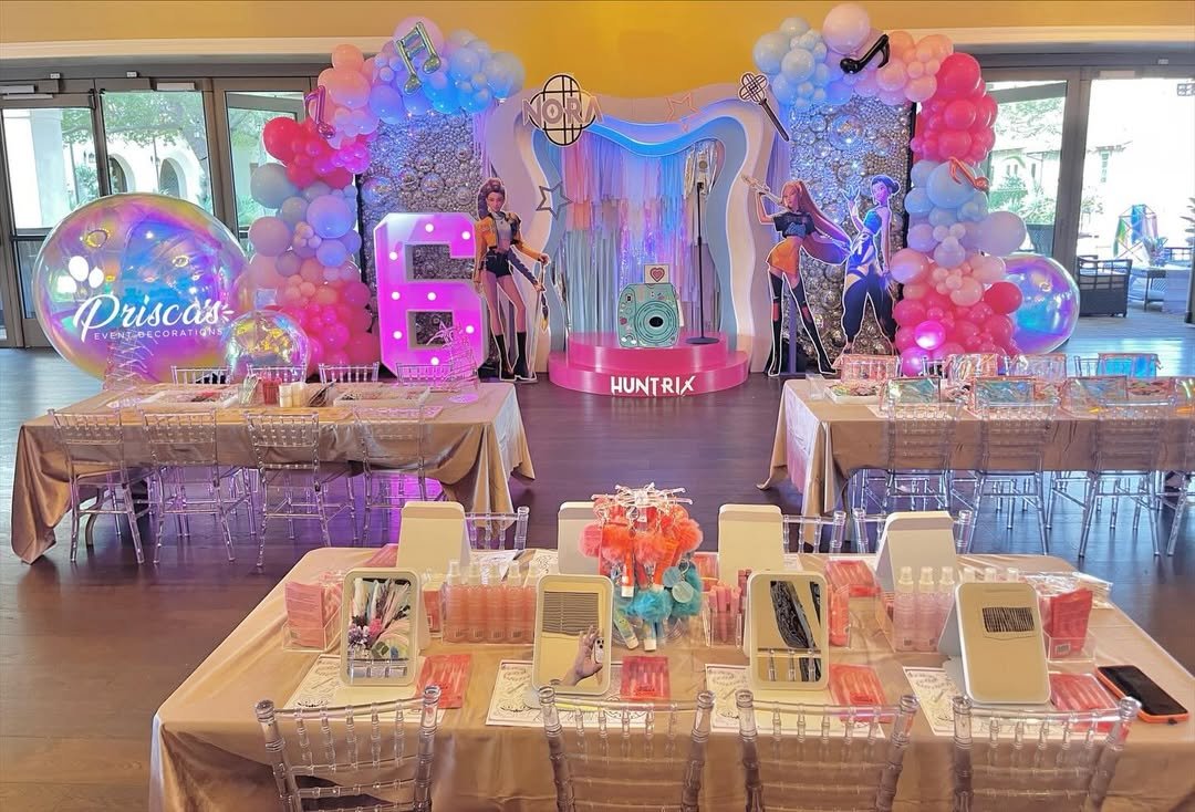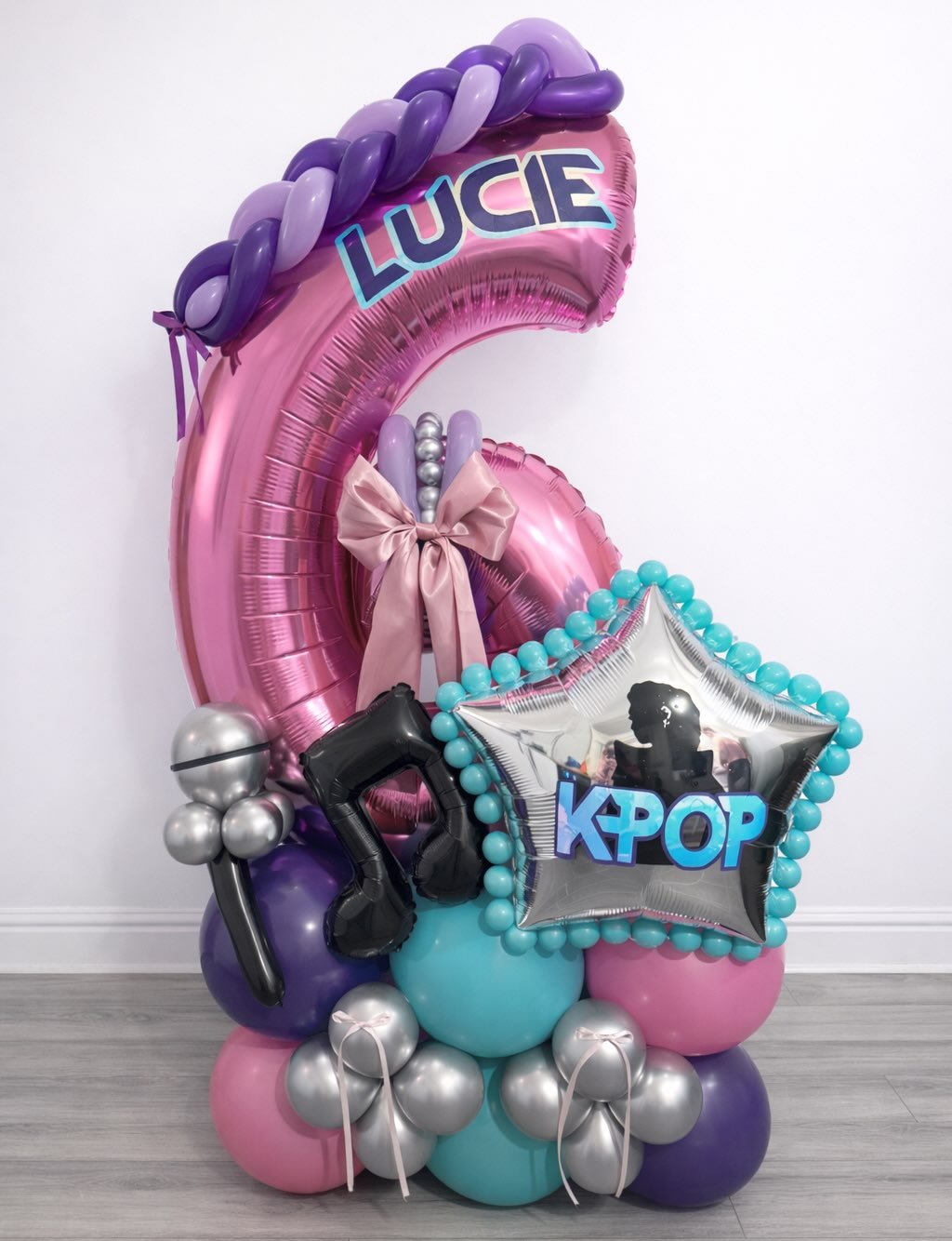 This setup feels like a mini concert tour stop, and I mean that in the best way. The oversized metallic “6” in pink instantly sets the stage, while the silver star balloon stamped with “KPOP” gives it that backstage VIP energy. Teal, purple, and glossy black accents add contrast so it doesn’t lean too sugary.