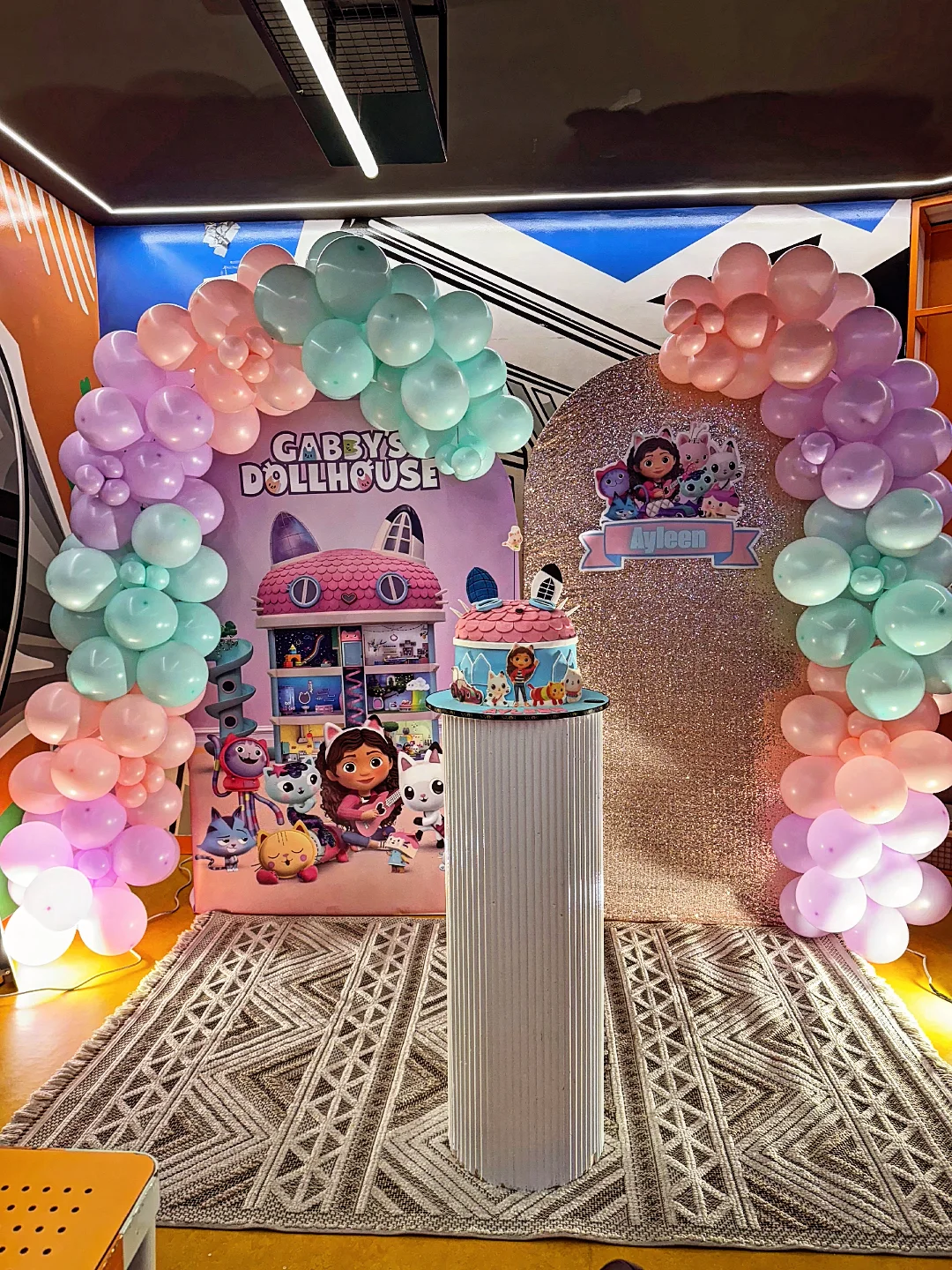 This one is full of color and character. The pastel balloon arch in mint, peach, and lilac frames the Gabby’s Dollhouse backdrop in a way that feels immersive. It’s playful, layered, and completely kid-approved.