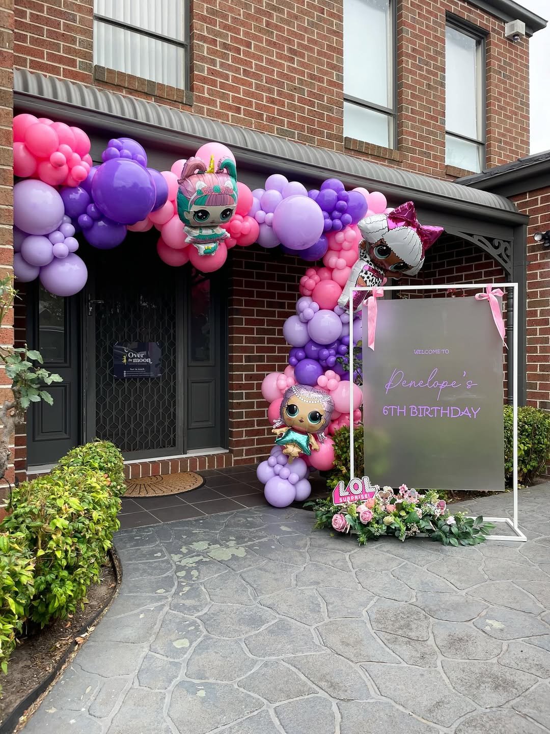 Pulling up to this setup feels like arriving at the chicest birthday on the block. Layers of pink and violet balloons frame the doorway, and those character balloons add that nostalgic, toy-aisle sparkle every six-year-old dreams about.