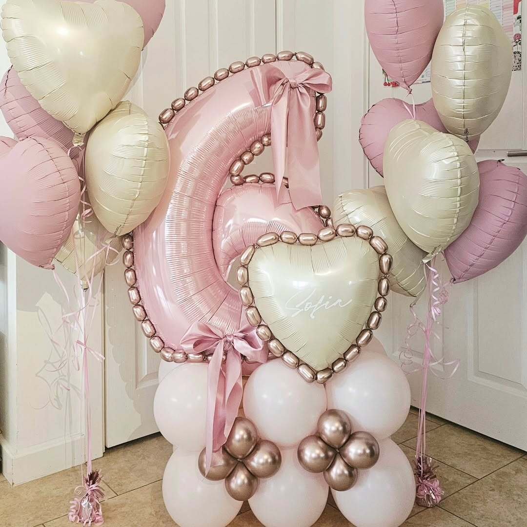 If six could feel sophisticated, this would be it. Soft blush, creamy ivory, and touches of rose gold create a gentle, almost heirloom-like palette. The pearl-trimmed number 6 and matching heart balloon with a custom name detail make it feel personal and thoughtful.