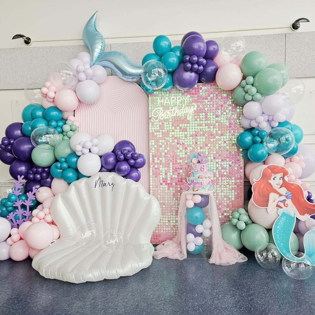 Soft teal, lavender, and pearly white balloons create an underwater fantasy that feels straight out of a storybook. The shimmering sequin backdrop catches the light in the prettiest way, almost like sunlight on water.