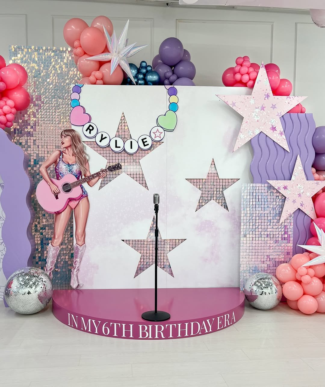 A little glam, a little pop star energy, and a whole lot of confidence. The stage-style platform, disco balls, and oversized stars create that concert vibe, while the pastel and purple balloon clusters soften it just enough for a sixth birthday.