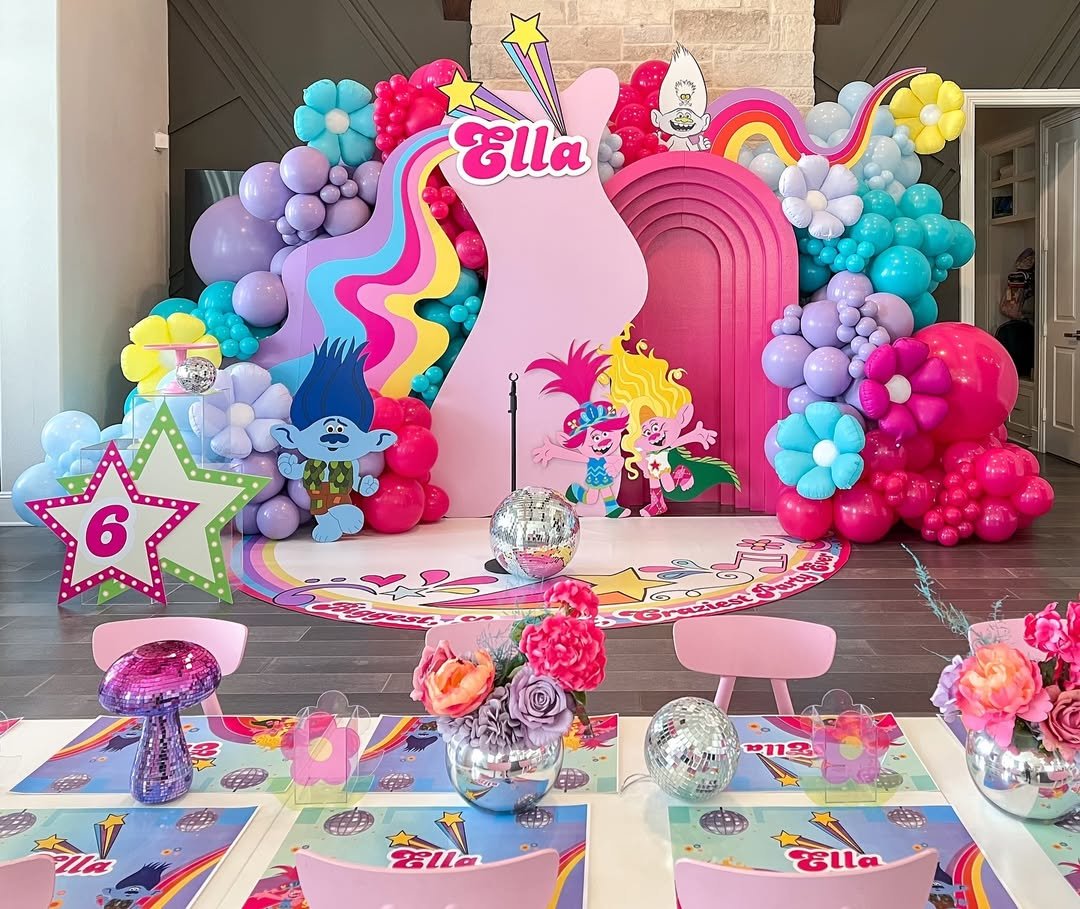 It’s playful, yes, but also styled. The floral centerpieces and coordinated place settings make it feel like a real event, not just a kids’ party. If you’re going bold with color overhead, keep the tables clean and cohesive so the space feels balanced and beautifully styled.