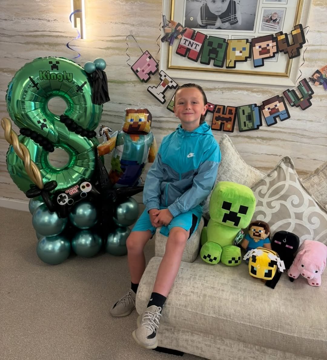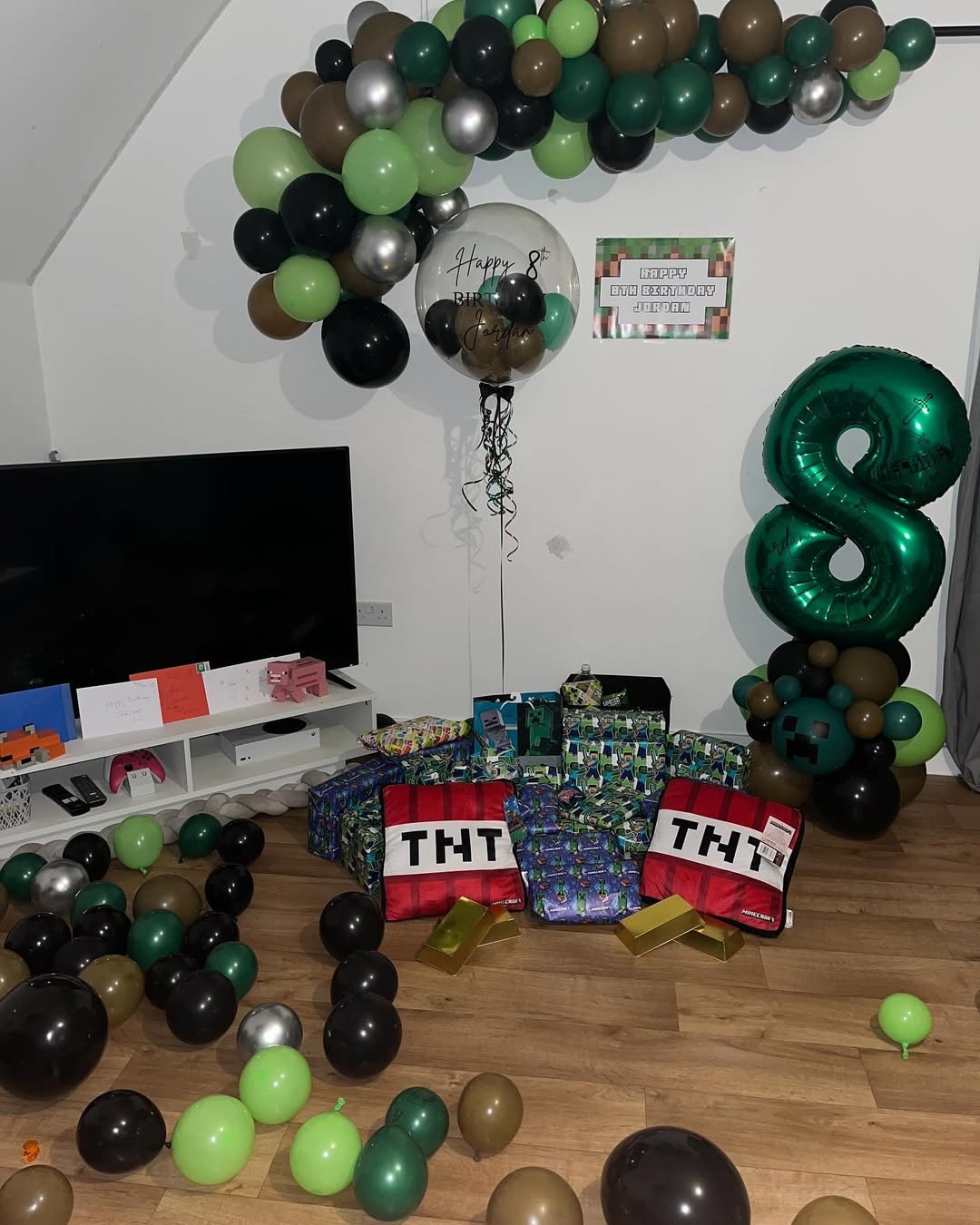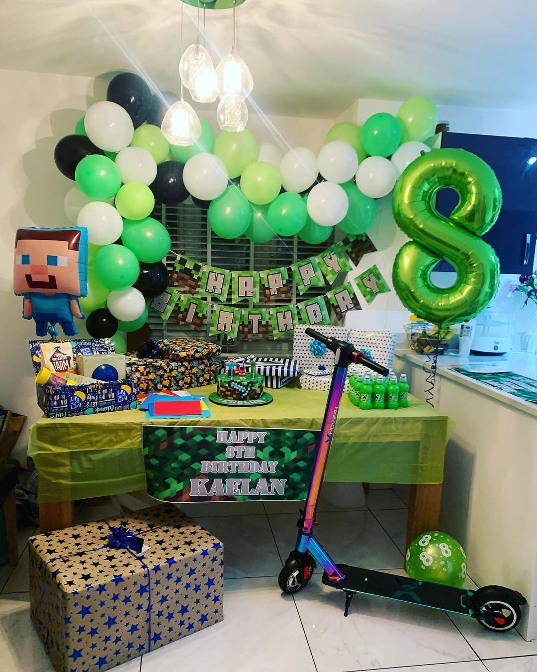 Green balloons, pixel banners, and a couch lined with plush characters instantly transport you into a block-built universe. The oversized number eight wrapped in themed details makes it clear this isn’t just a party, it’s a full experience.