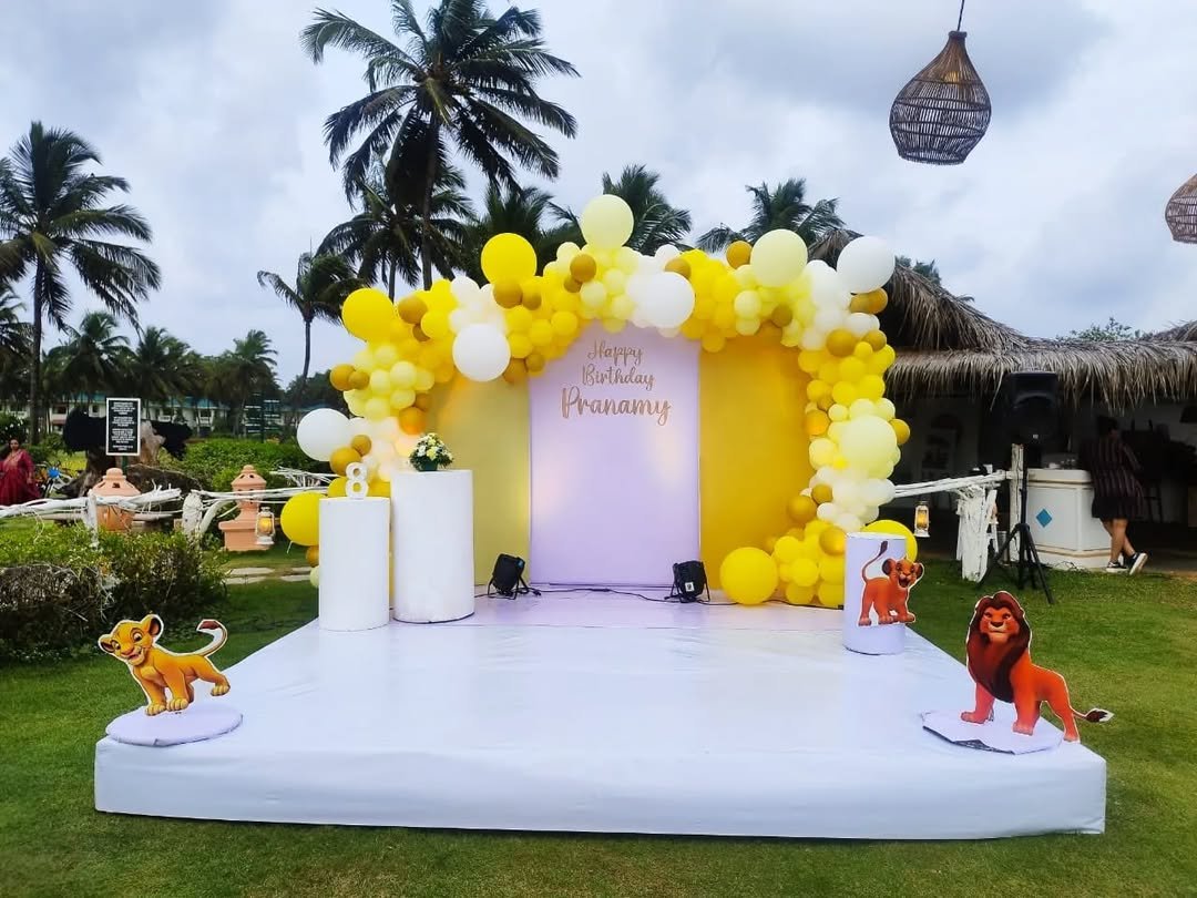 The yellow balloon arch and character cutouts bring sunshine to the entire lawn. To make it fall-friendly, shift that bright lemon into mustard, marigold, and soft cream, almost like a field of autumn wildflowers.