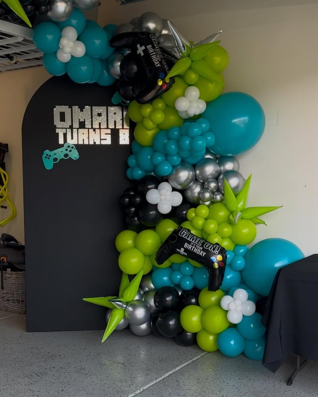 Teal, lime green, black, and chrome silver come together in a layered balloon wall that feels modern and cool. The game controller balloons are such a fun detail, and the dark backdrop lets the colors pop without fighting for attention.