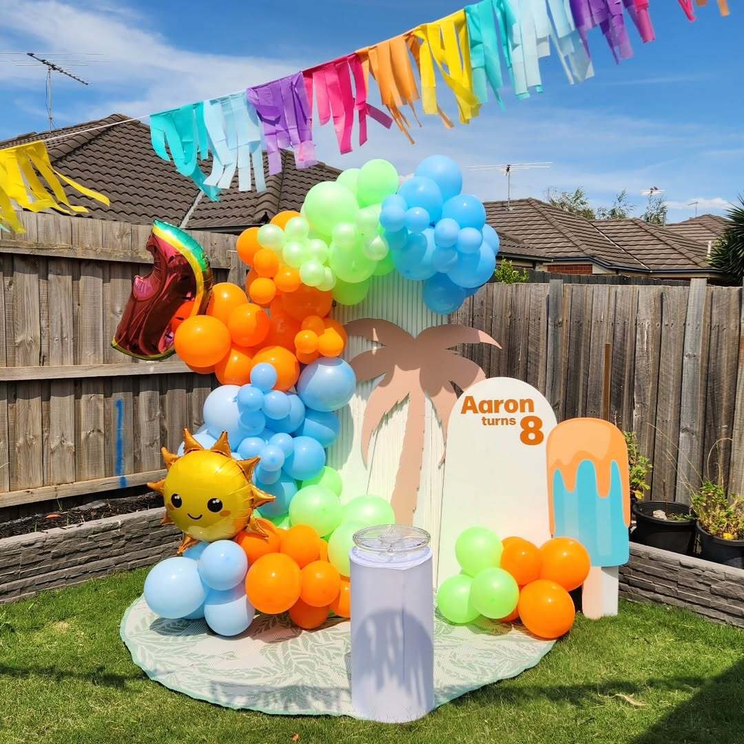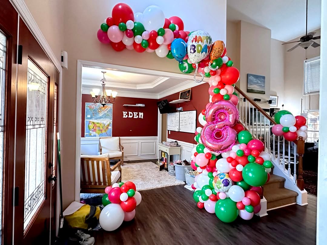 There’s something about a grand balloon installation that instantly raises the energy of a home. It transforms everyday architecture into part of the party design. Bold color, layered sizes, and a little sparkle go a long way in making an eighth birthday feel truly unforgettable.