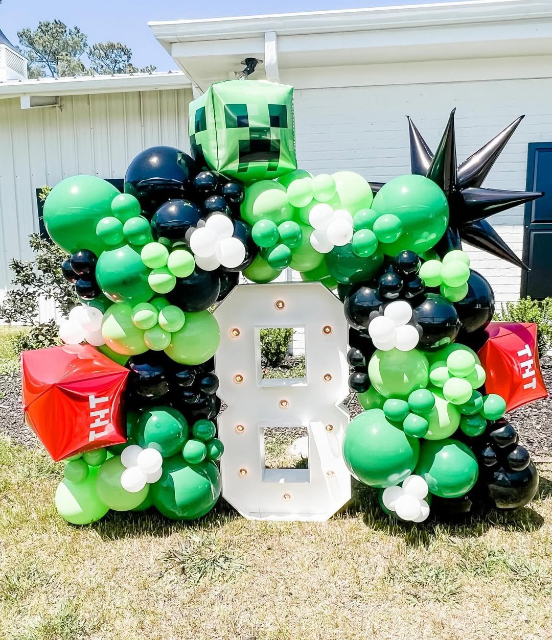 This setup is pure Minecraft magic brought into the real world. The bold mix of green, black, and white balloons instantly sets that pixel-perfect mood, while the oversized Creeper steals the spotlight like a true guest of honor. The glossy textures and layered clusters create depth, making the whole display feel immersive rather than just decorative.