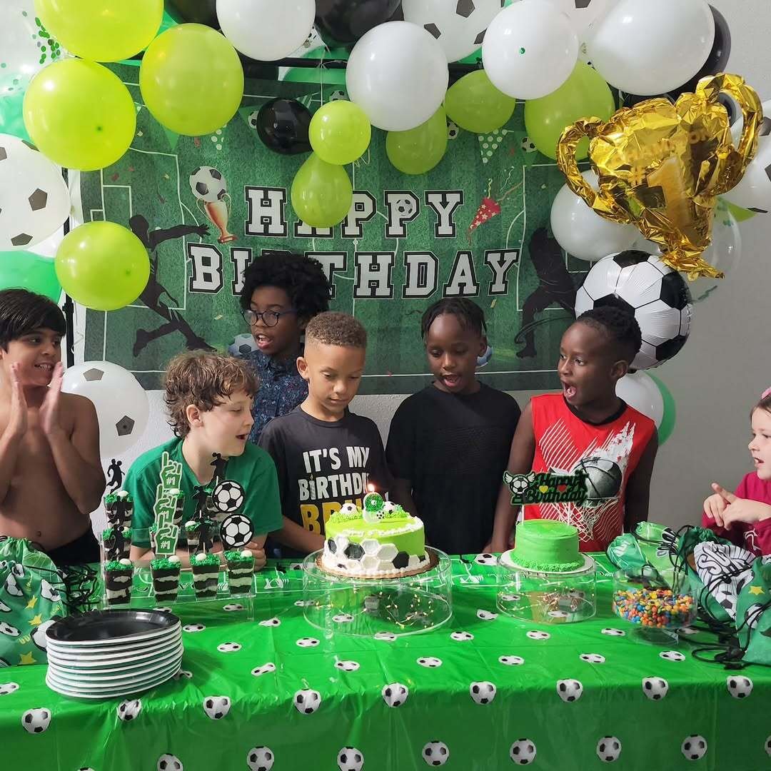 Green and white balloons, soccer motifs, and a dessert table packed with detail give this celebration so much personality. For fall, think deep olive, cream, and touches of burnt orange layered into the garland for a richer, cozier feel.