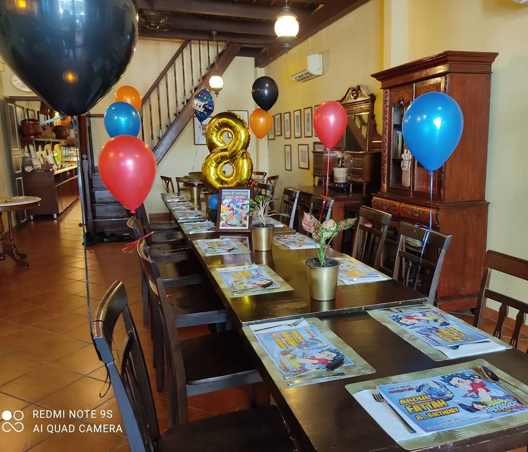 Long wooden tables, colorful balloons rising above each chair, and a golden number eight catching the light at the center of it all. There’s a charming contrast between the traditional interiors and the playful pops of red, blue, and orange. It feels festive without losing its sense of place.