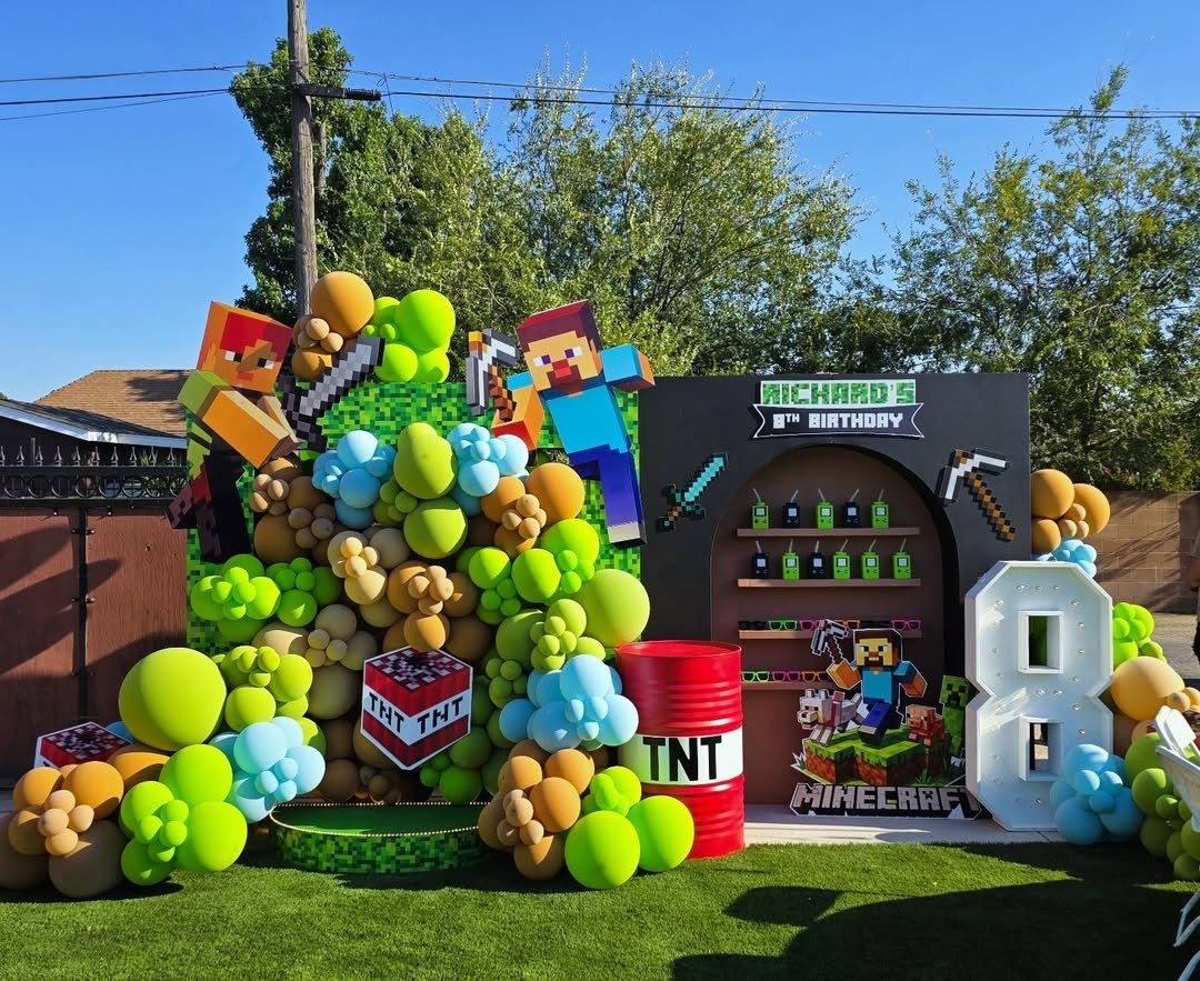 This setup is pure joy for any little gamer. The layered balloon garland in fresh greens, sandy neutrals, and soft sky blues instantly builds that pixel-world vibe, while the oversized character cutouts bring the scene to life. Every corner feels playful and immersive, like you’ve stepped straight into a Minecraft adventure.