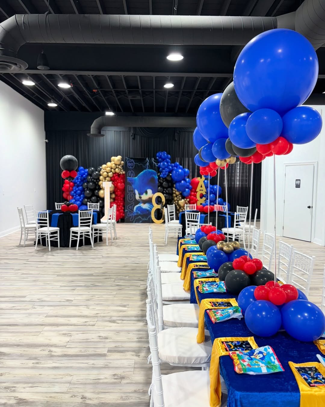 This one is pure energy. Red, cobalt, black, and gold balloon columns stretch across the room, leading your eye straight to that dramatic Sonic backdrop. Even the tables carry the theme through with layered linens and coordinated balloon toppers, which makes the entire space feel immersive.