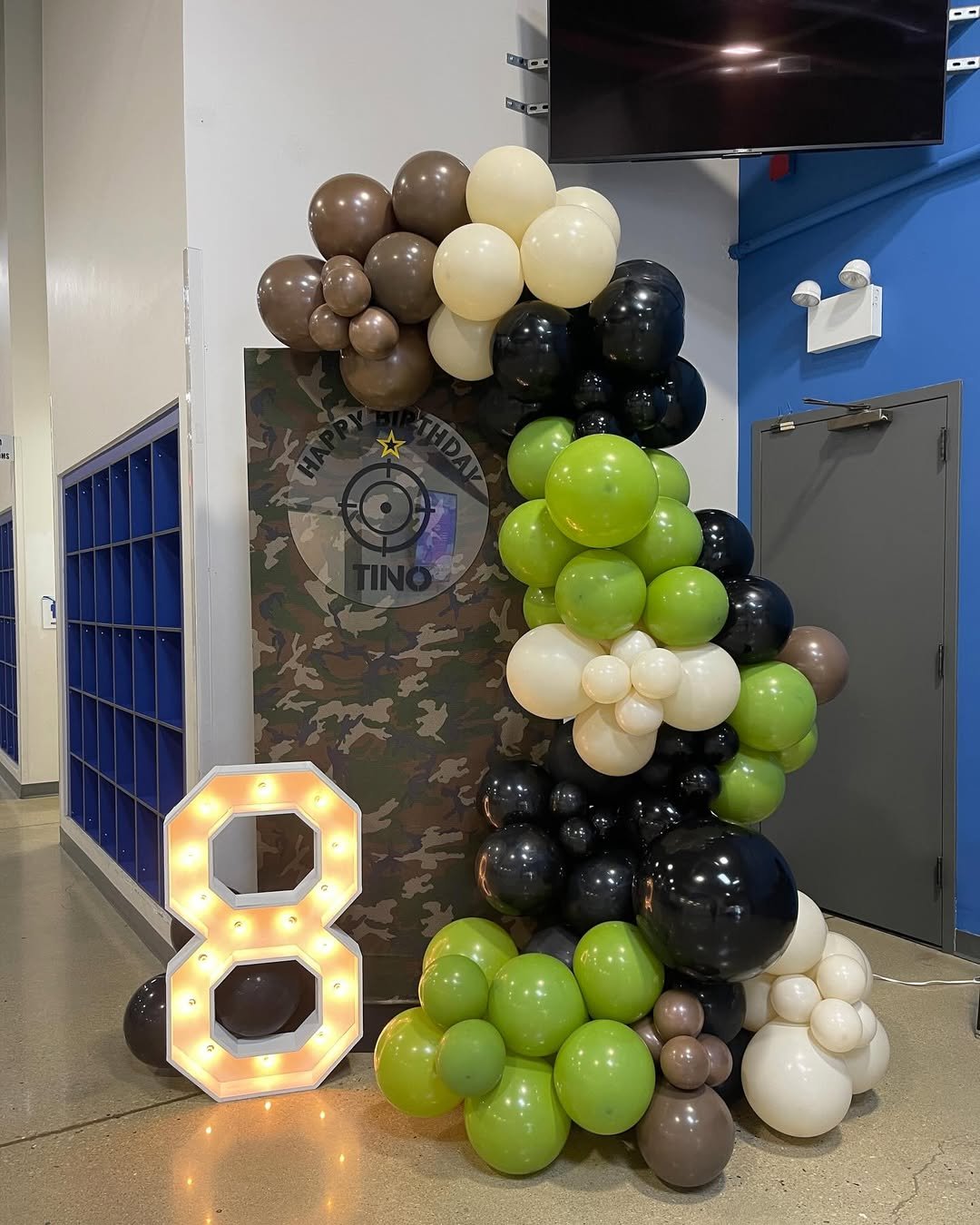 The balloon garland climbs organically, almost like foliage, which softens the harder military theme. I love when texture does the heavy lifting. Mixing matte and glossy balloons keeps it layered and interesting, not flat.