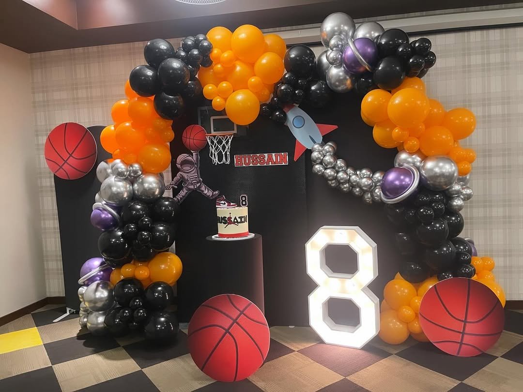 Now this is how you blend themes. Basketball meets outer space with a swirl of orange, black, silver, and hints of purple. The arch frames the backdrop like a spotlight, and those oversized basketball props ground the whole design.