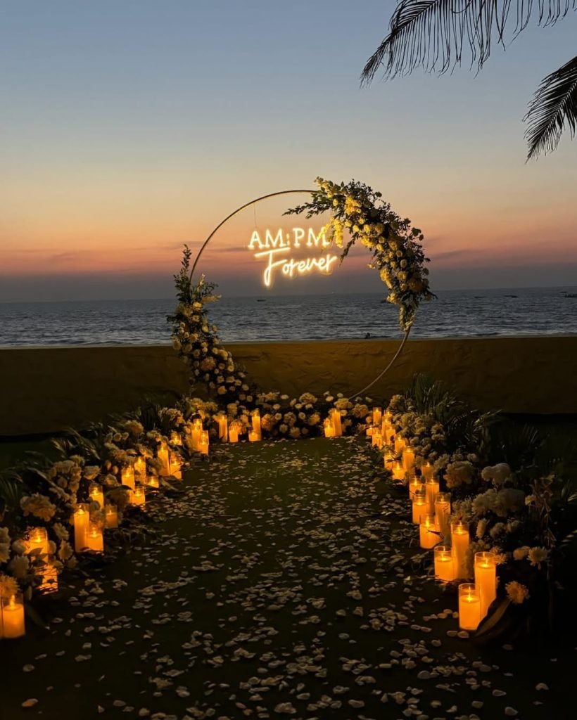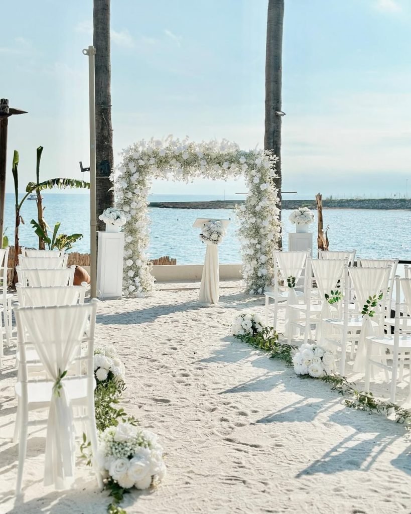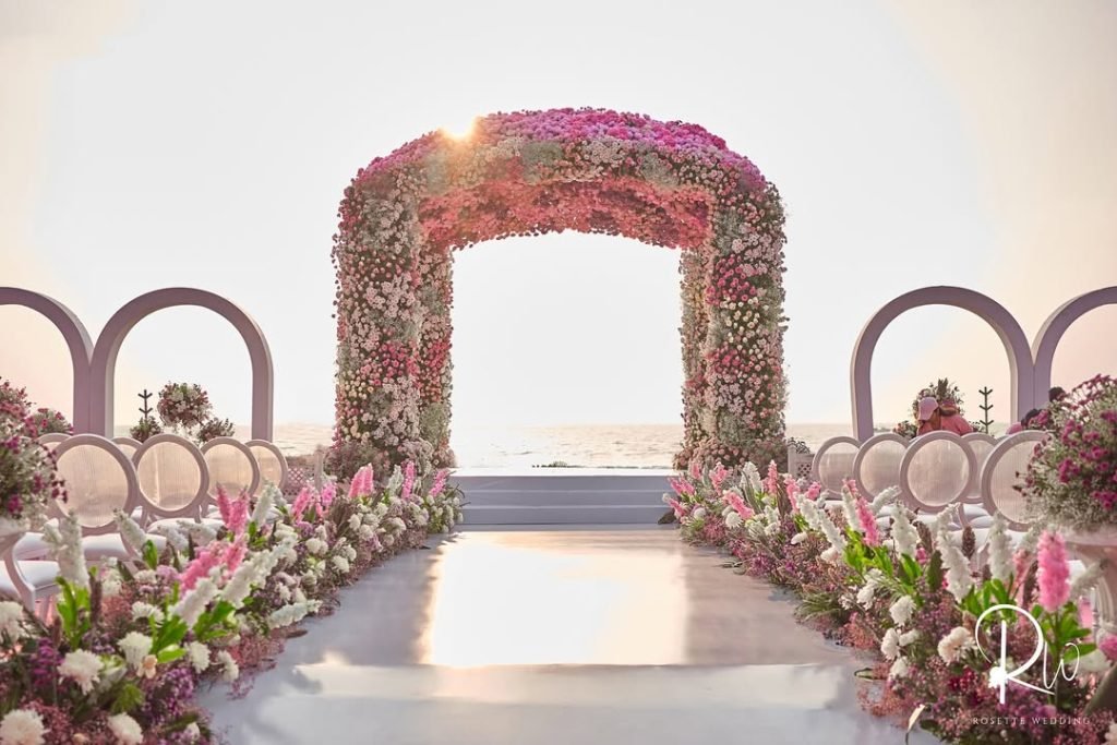 This isn’t just a ceremony setup. It’s a scene from a modern romance novel where the sky glows, the tide hushes, and love speaks the loudest.