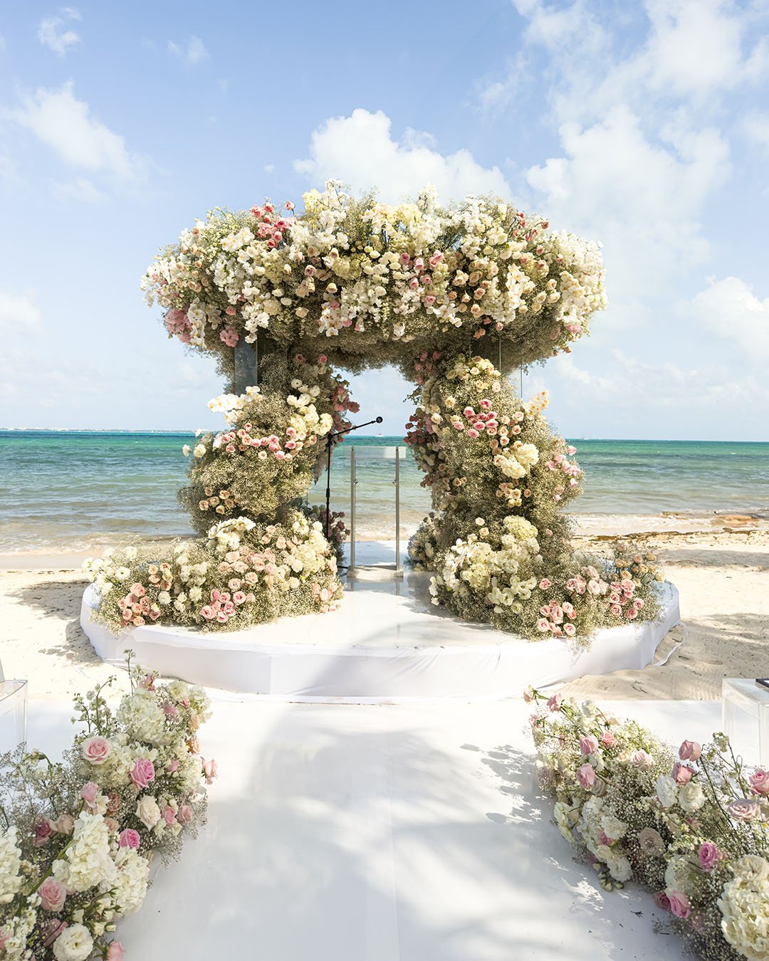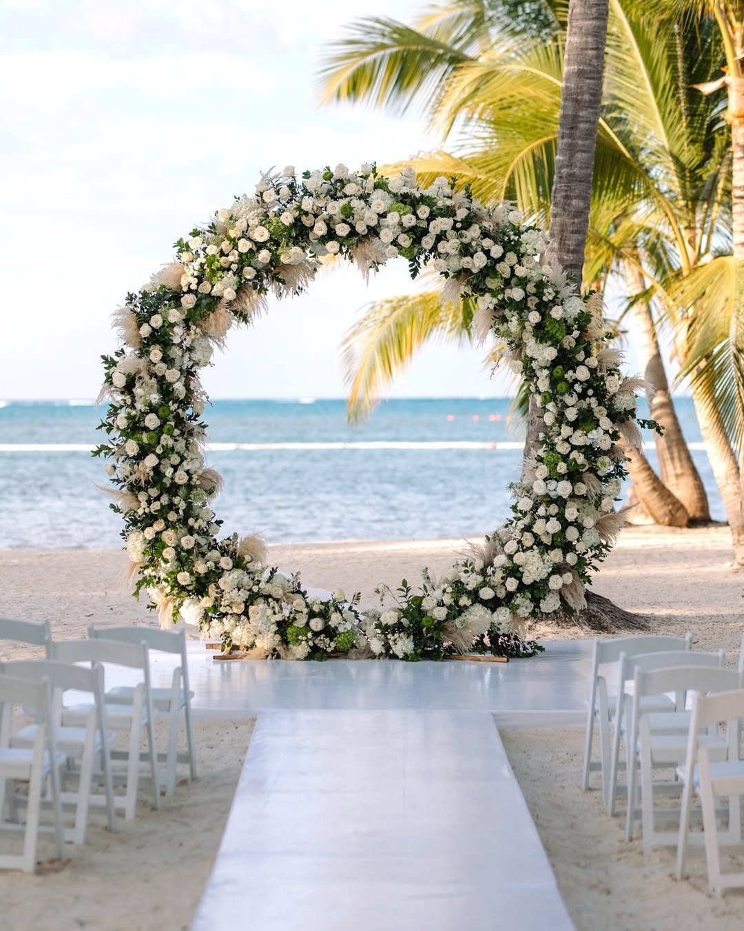 If I could bottle up a feeling, it would be this: soft ocean breeze, sunshine on my skin, and a floral arch so dreamy it feels like walking straight into a fairytale. The oversized circle of creamy roses and pampas grasses? I’m obsessed.