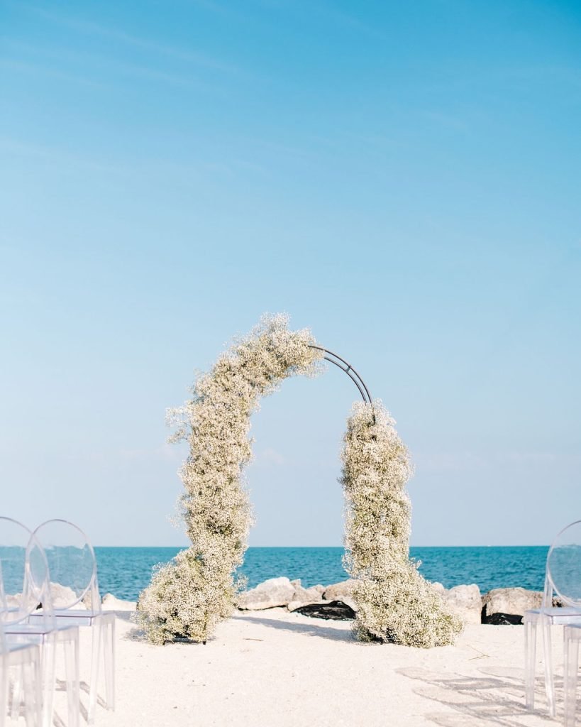 A bent arch of baby’s breath curves gently toward the ocean, its airy texture echoing the clouds above and the waves beyond. Lucite ghost chairs nearly disappear into the sand, allowing the minimalist design and cerulean view to take center stage.