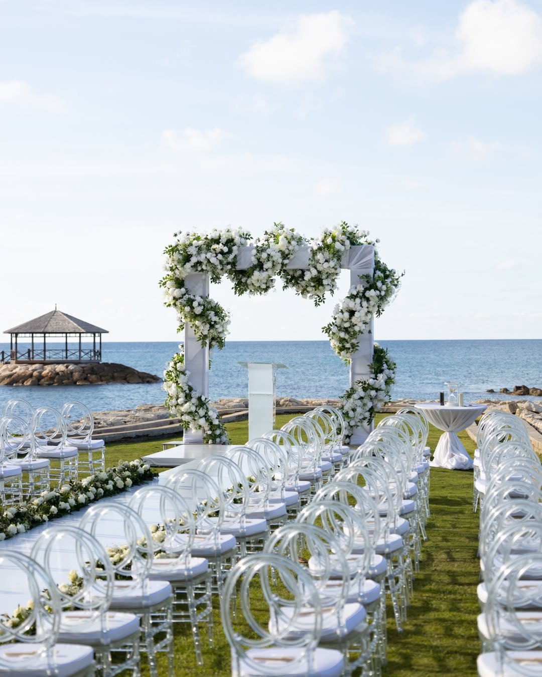 Crystal chairs and delicate white florals line the aisle, echoing the calm of the ocean beyond. The floral arch, lush and symmetrical, feels like a whisper of a wave—gentle, endless, and full of promise.