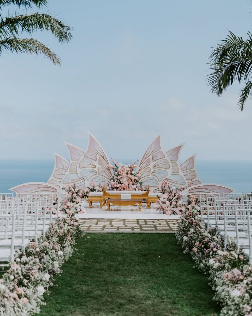 Butterfly wings and ocean breezes? I’m obsessed. This ceremony setup feels like walking straight into a dream — layers of soft blush florals, sweeping petals framing the sky, and that endless ocean just waiting to make it official.
