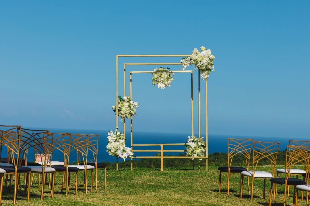 A wooden triangle arch nods to modern minimalism, softened by wisps of white blooms and cascading greenery. Golden chairs dot the sand in perfect rows, each tied with fresh florals that sway just slightly in the sea breeze.