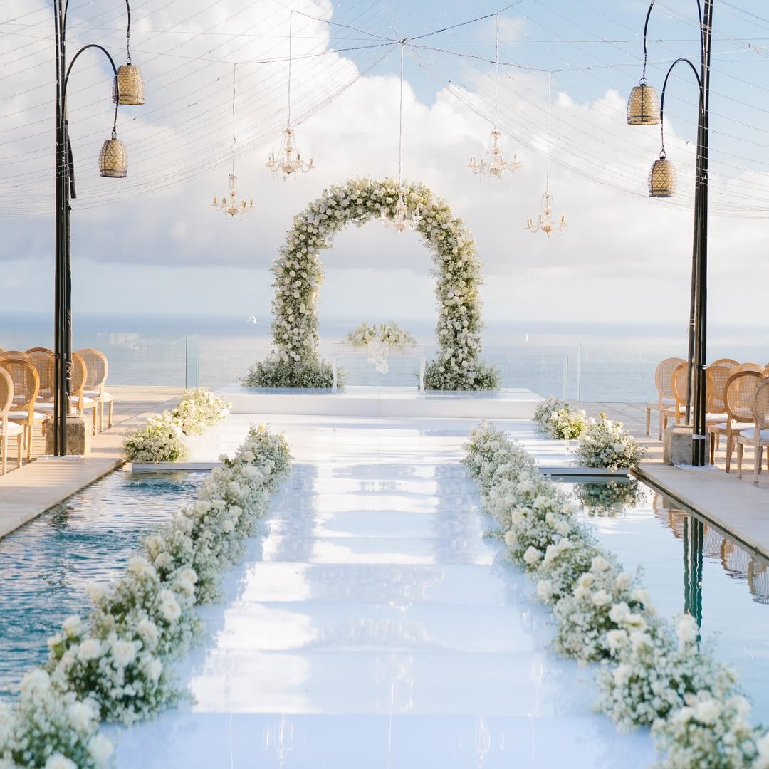 I can still feel my jaw drop just looking at this setup — a floating aisle over crystal water, endless ocean views, and chandeliers swaying like a dream above it all. It’s the kind of ceremony that feels straight out of a love story… the one where you don’t even notice you’re crying until the sun catches your tears.