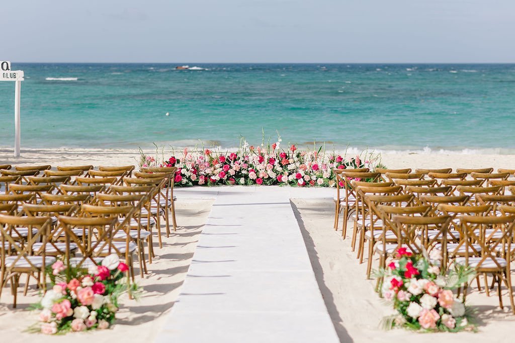 A sea breeze, soft sand, and a burst of florals in bold romance tones — this ceremony design is a vision of tropical sophistication.