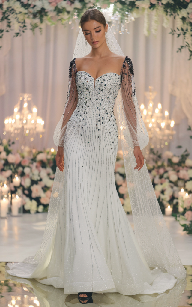 The fitted silhouette hugs the figure with liquid elegance, flowing into a dreamy train that glistens with each step. Delicate silver beadwork drips from the bodice like falling stars, elongating the frame and adding a mesmerizing sense of movement. The sheer, billowing sleeves—adorned with intricate beading that fades into the softest touch—give the illusion of weightless grace, while the barely-there off-shoulder design adds a whisper of sensuality.