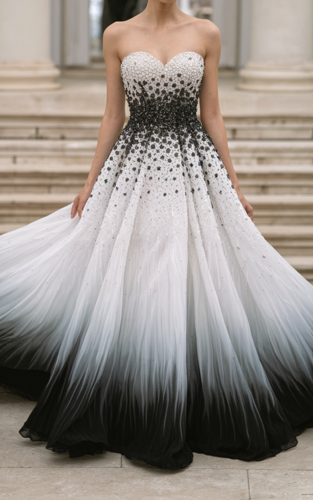 The structured sweetheart bodice is adorned with delicate, celestial embellishments—intricate stars and sequins that twinkle like a constellation against a starlit sky. As the gown cascades downward, the gradient effect intensifies, the pristine white tulle melting into a rich black hemline, as if dipped into the universe itself. The voluminous skirt flows effortlessly, creating a mesmerizing movement that mimics the night sky shifting before dawn.