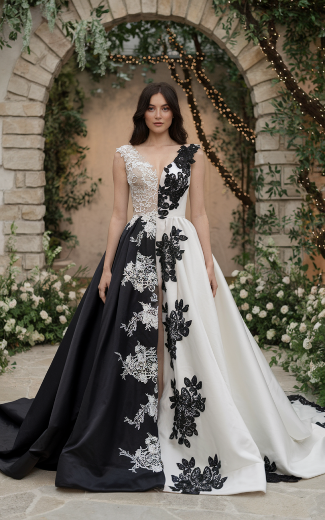 Black and white wedding dresses are the ultimate statement of elegance, sophistication, and bold style. Whether you’re drawn to a dramatic black lace overlay, a modern color-blocked design, or a dreamy white gown with striking black accents, this timeless combination is perfect for brides who want to stand out.