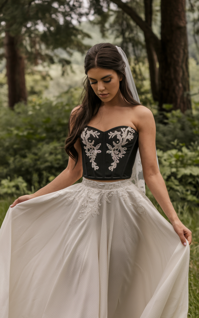 The structured black corset, adorned with delicate silver embroidery, is a striking departure from convention. It carves out a silhouette of strength and sophistication, a nod to vintage elegance with a rebellious twist. Flowing beneath, the ivory skirt cascades like a dream, its airy fabric laced with subtle embroidery, bringing softness to the boldness above. The delicate veil trails behind like a whisper of tradition, blending the past with the present.