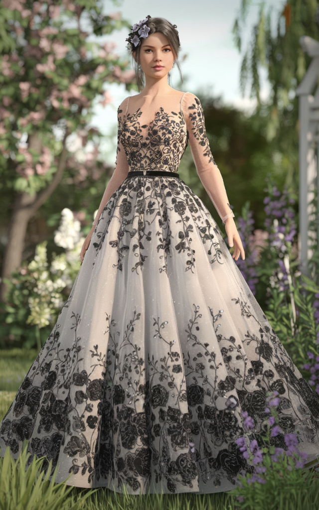 A delicate black belt cinches the waist, defining a silhouette that feels both regal and effortless. Paired with soft floral accents in the hair and the dreamlike setting of a sun-dappled garden, Midnight Bloom is a storybook come to life—a dress for the romantic at heart, the dreamer who walks between light and shadow, forever captivating.