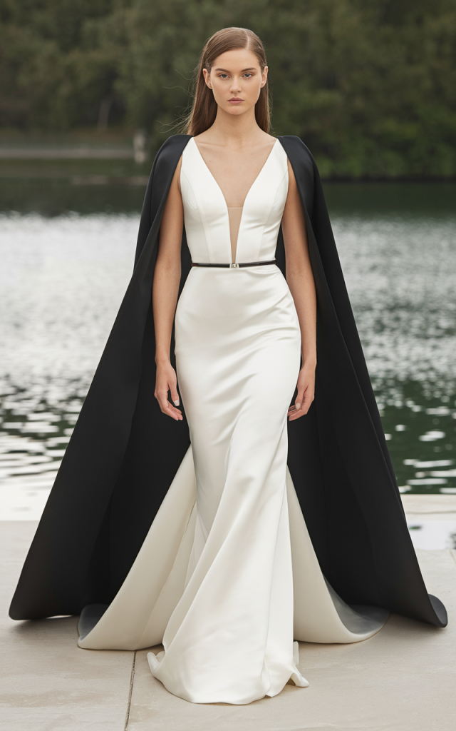 A sculpted, form-fitting white satin dress glides effortlessly over the body, accentuating every curve with an understated allure. The plunging neckline adds a whisper of daring, while a delicate black belt cinches the waist, a subtle nod to timeless tailoring. But the true showstopper? The flowing black cape—an emblem of authority and elegance, cascading behind like the wings of a midnight monarch.