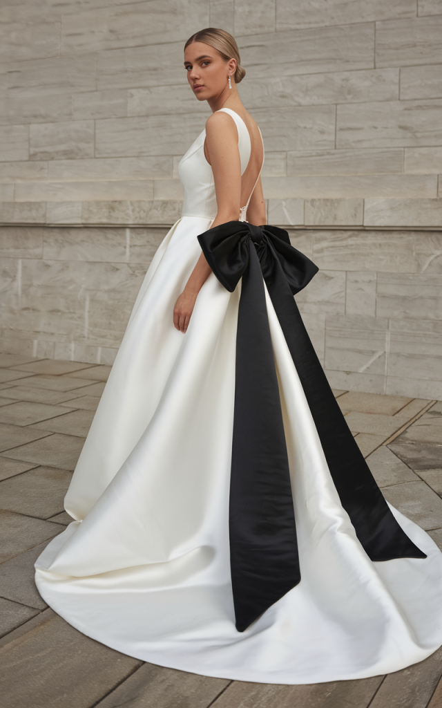 The open back, framed by delicately structured straps, adds an element of sensuality without excess. The voluminous bow, tied with precision, transforms this refined silhouette into a breathtaking study in contrast, proving that simplicity and boldness can coexist in perfect harmony.