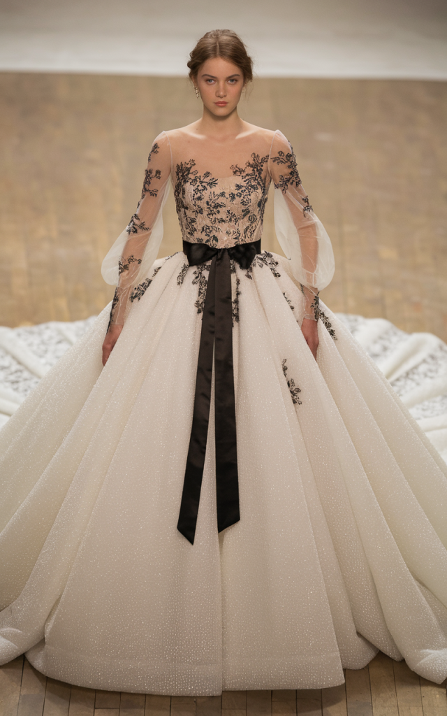 The sheer illusion neckline and sleeves are delicately adorned with intricate black floral embroidery, like branches stretching across a twilight sky. The soft puffed sleeves add an air of vintage romance, balancing the ethereal glow of the gown’s voluminous, glittering skirt. A sweeping black satin ribbon cinches the waist, a striking contrast that defines the silhouette with dramatic precision.
